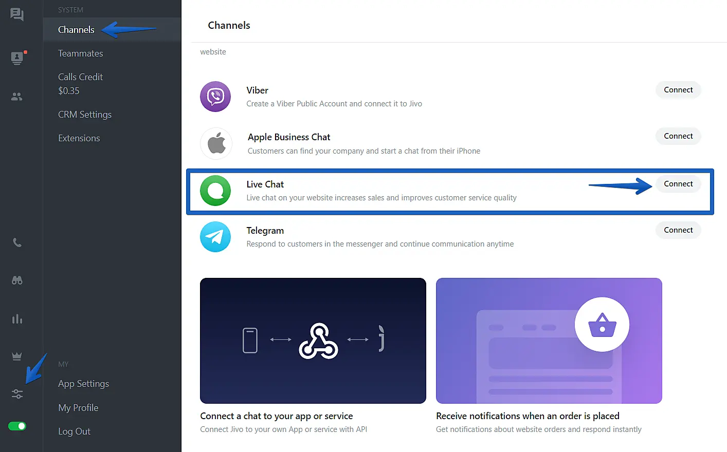 Log in to the JivoChat Web or Desktop app and go to "Manage"-> "Channels".