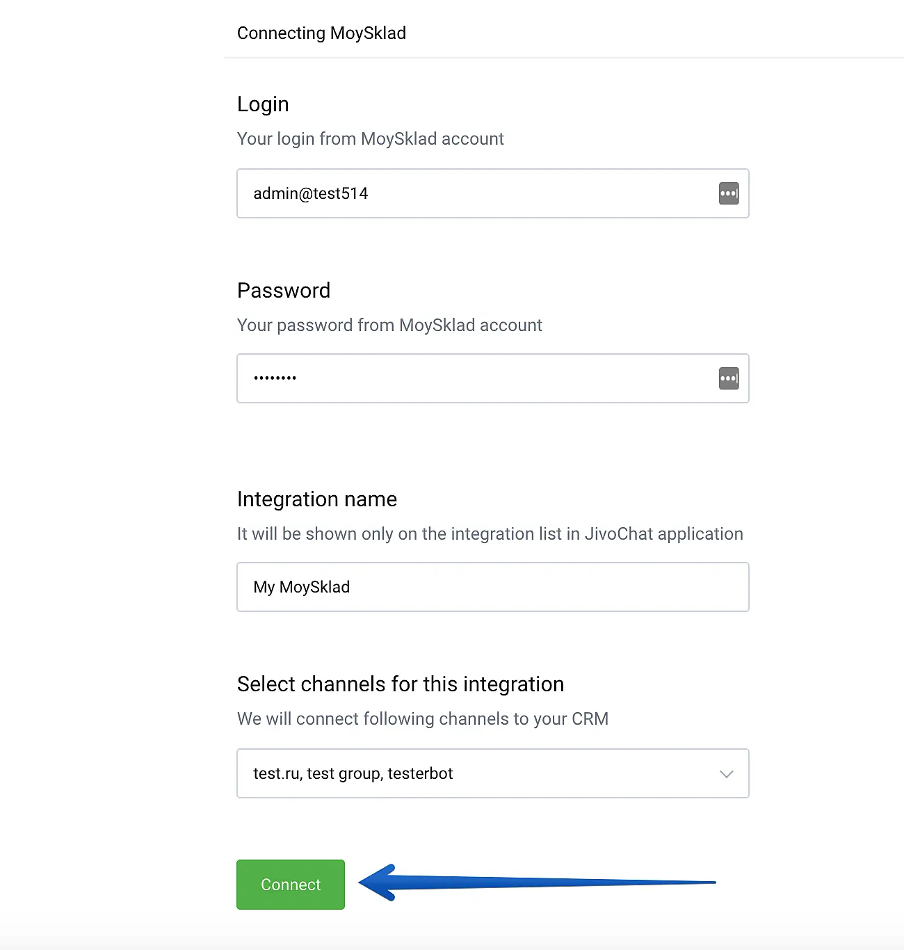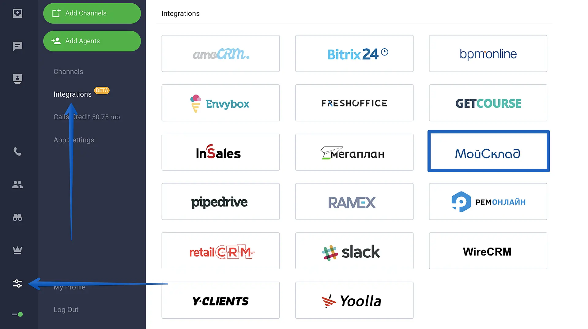 To connect MoySklad go to JivoChat application, open Manage panel, proceed to Integrations and click on MoySklad.