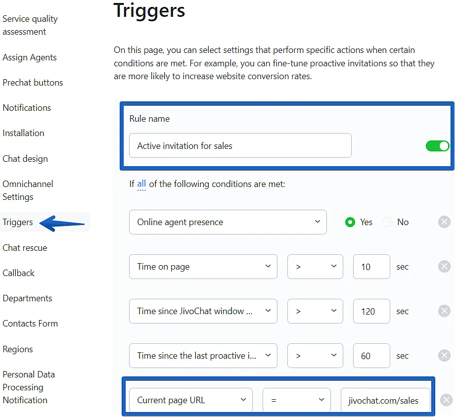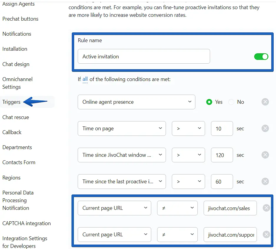 The essence of this method is that you can make several rules for proactive invitations, where you will set them for certain pages by using the ‘URL of the current page’ condition. This method has a maximum limit of 10 proactive rules.