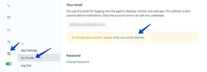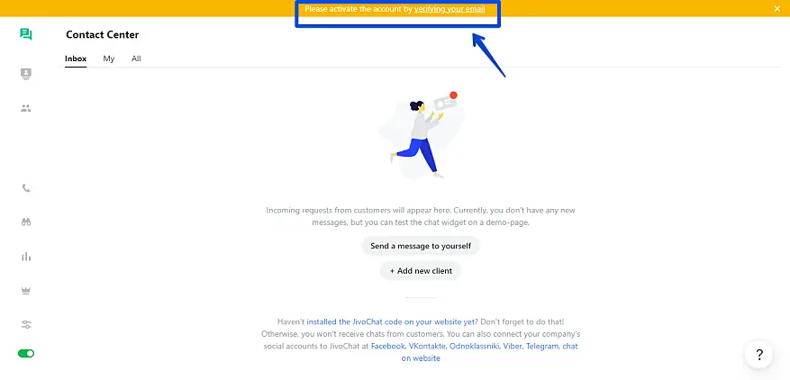 Until the email is verified, you will see this notification in all sections of the JivoChat application: