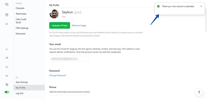 Your email has now been verified and you can take full advantage of your JivoChat profile.