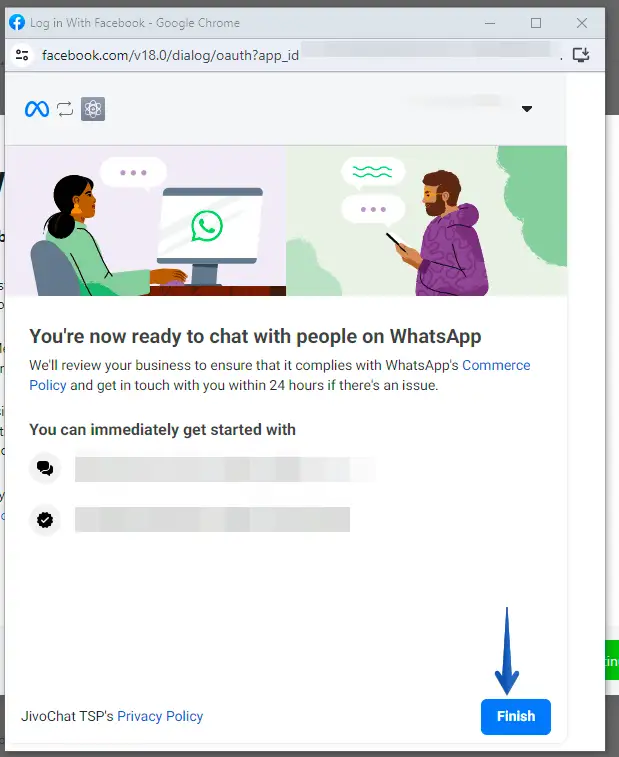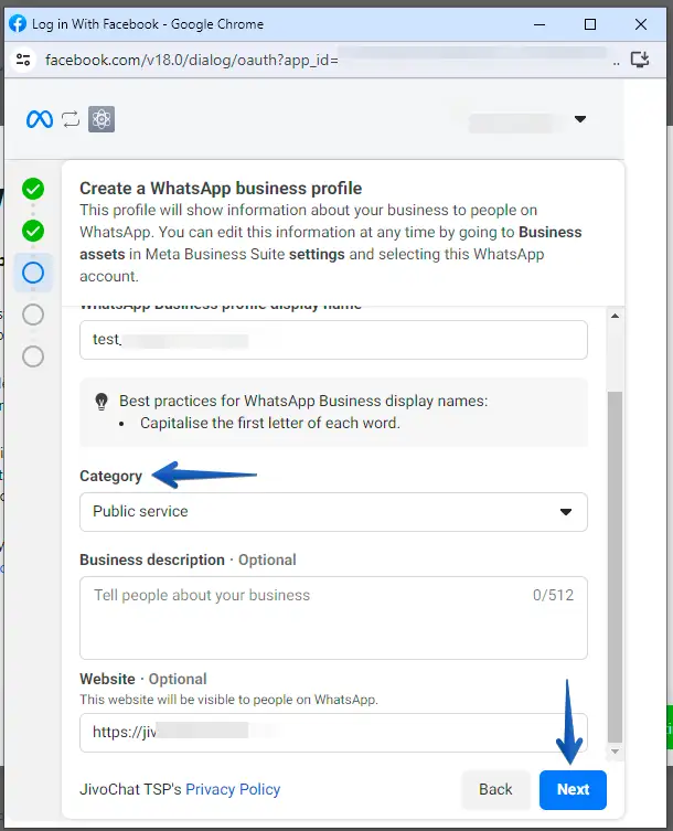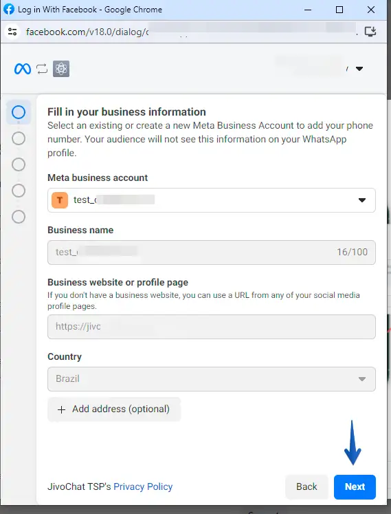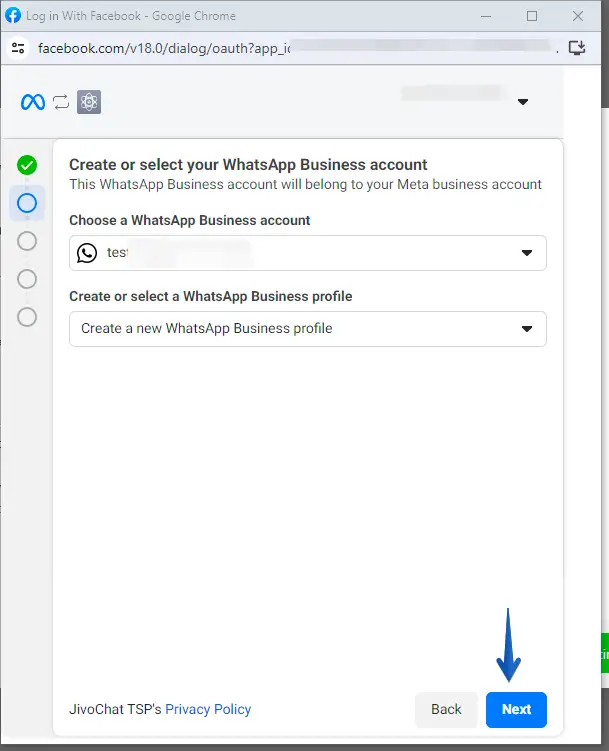 Choose a WhatsApp Business Account or create new one, and then click on "Next"