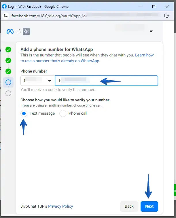 Add your phone number and choose how you would like to verify it, and click on "Next"