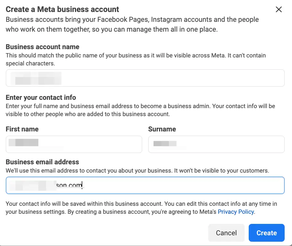 A- Go to on https://business.facebook.com/home/ and press the button "Create a business account"B- Fill in the main fields and press "Create" as it is shown below:
