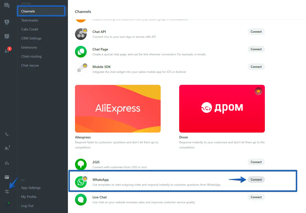 Open Channels setting and find WhatsApp there, then click "Connect".